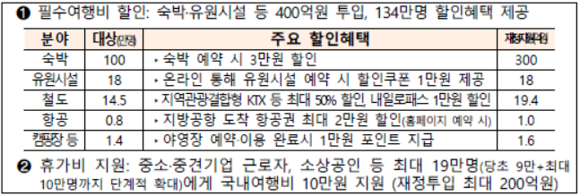 정부는 600억 원의 재정을 투입하여 100만 명에게 숙박비 3만 원씩을 지원하고, 18만 명에게 온라인으로 유원지 시설 예약 시 1만 원 할인 쿠폰을 지급하고, 또 철도, 항공, 캠핑장 이용객에게도 할민 및 포인트를 지급하는 등 이 밖에도 많은 내용을 담고 있는 " 내수 활성화 대책"을 3월 29일 대통령 주재 『제15차 비상경제민생회의』에서 발표하였습니다.